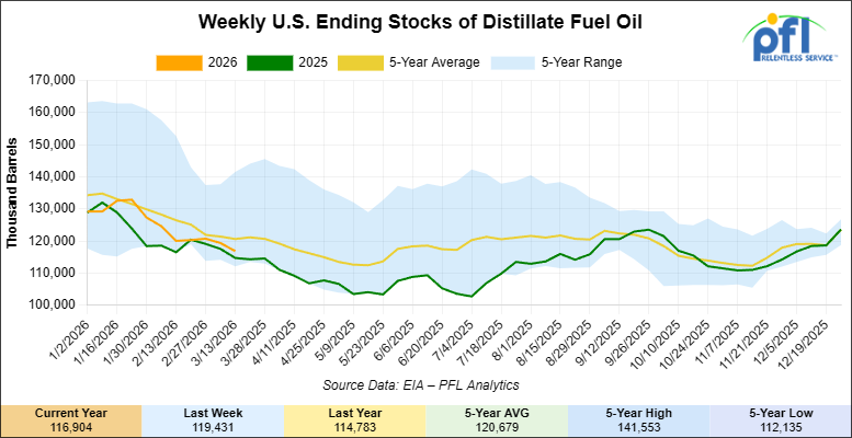 Distillate fuel inventories decreased by 2.5 million barrels week-over-week and are 3% below the five-year average for this time of year.