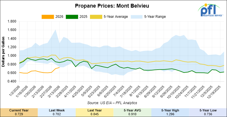 Propane prices closed at 72.9 cents per gallon on Friday of last week, up 2.7 cents per gallon week-over-week, but down 11.6 cents year-over-year.