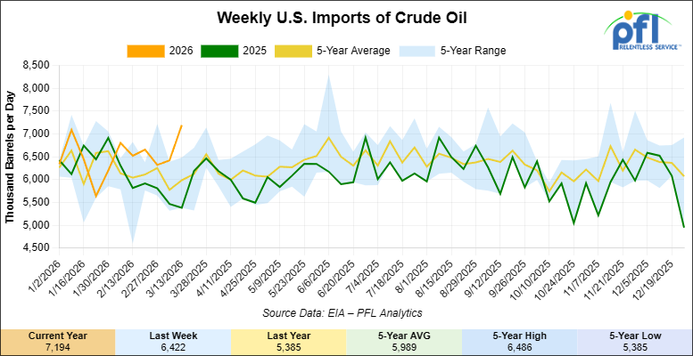 U.S. crude oil imports averaged 7.2 million barrels per day during the week ending March 13, 2026, an increase of 772,000 barrels per day week-over-week. Over the past four weeks, crude oil imports averaged 6.7 million barrels per day, 17.8% more than the same four-week period last year. Total motor gasoline imports (including both finished gasoline and gasoline blending components) averaged 447,000 barrels per day, and distillate fuel imports averaged 221,000 barrels per day during the week ending March 13 2026.