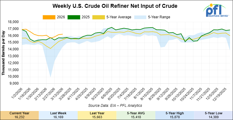 U.S. crude oil refinery inputs averaged 16.2 million barrels per day during the week ending March 13, 2026, which was 63,000 barrels per day more week-over-week.
