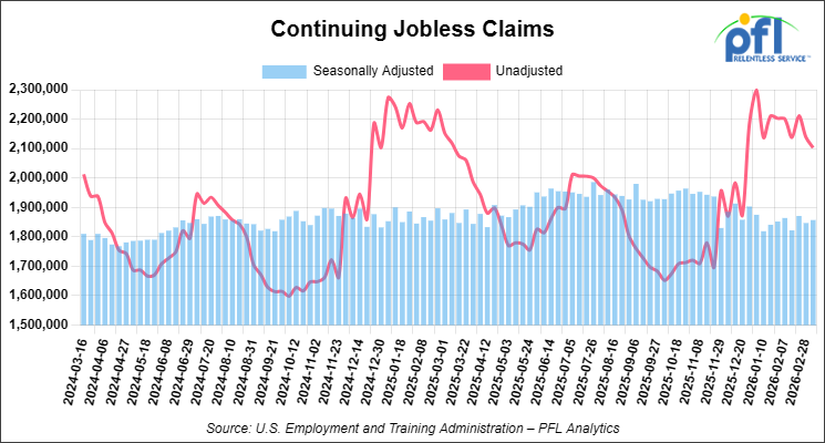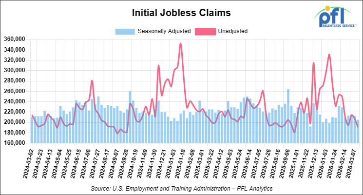 • Initial jobless claims seasonally adjusted for the week ending March 14, 2026 came in at 205,000, versus the adjusted number of 213,000 people from the week prior, down 8,000 people week over week.