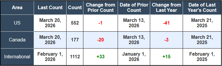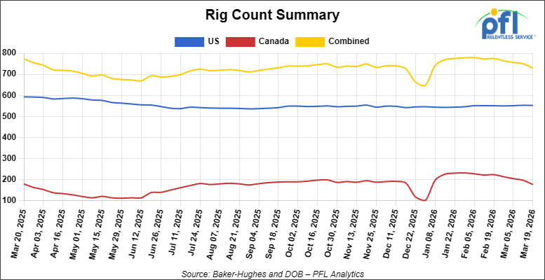 North American rig count was down by -21 rigs week-over-week. The U.S. rig count was down by -1 rig week-over-week, and down by -41 rigs year-over-year. The U.S. currently has 552 active rigs. Canada’s rig count was down by -20 rigs week-over-week and down by -3 rigs year-over-year. Canada currently has 177 active rigs. Overall, year-over-year we are down by -44 rigs collectively.