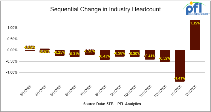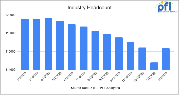 Class I railroads employed 116,364 workers in the United States in February 2026, a 1.35% increase from January 2026’s count of 114,811 but a -2.67% year-over-year decrease from February 2025’s total of 119,562, according to Surface Transportation Board data.