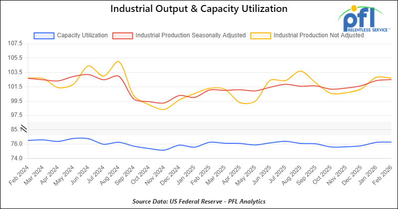 Manufacturing accounts for approximately 75% of total output. Manufacturing output in February was up 0.20% from January of 2026.