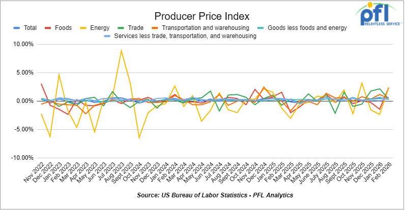 In February 2026, the Producer Price Index (PPI) for final demand rose 0.3% month-over-month, easing from the 0.5% increase in January but still indicating continued upstream price pressures. Core PPI (final demand less foods, energy, and trade services) increased 0.2% month over month, slightly below January’s pace. The monthly increase was driven primarily by services, which rose 0.4%, while goods increased 0.2%. Within goods, food prices rose modestly, while energy prices were mixed; goods less foods and energy increased 0.3%, suggesting steady core goods pricing. Within services, trade margins continued to firm, while transportation and warehousing posted moderate gains, and services less trade, transportation, and warehousing were relatively subdued, indicating more balanced services inflation compared to January.