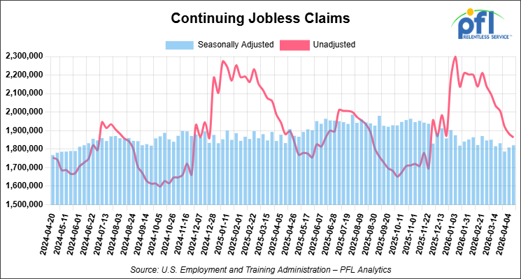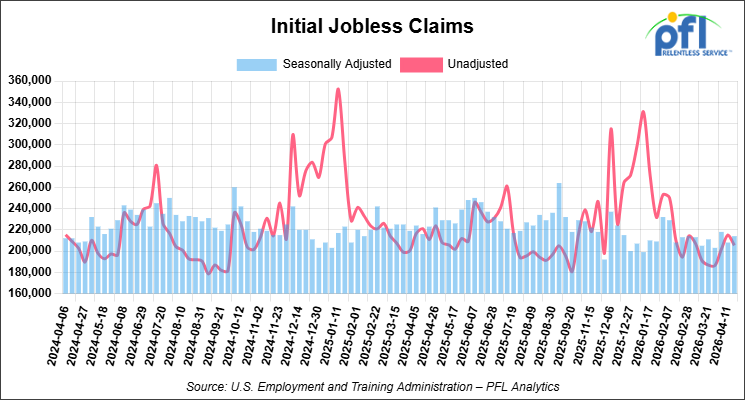 • Initial jobless claims seasonally adjusted for the week ending April 18, 2026 came in at 214,000, versus the adjusted number of 208,000 people from the week prior, up 6,000 people week over week.