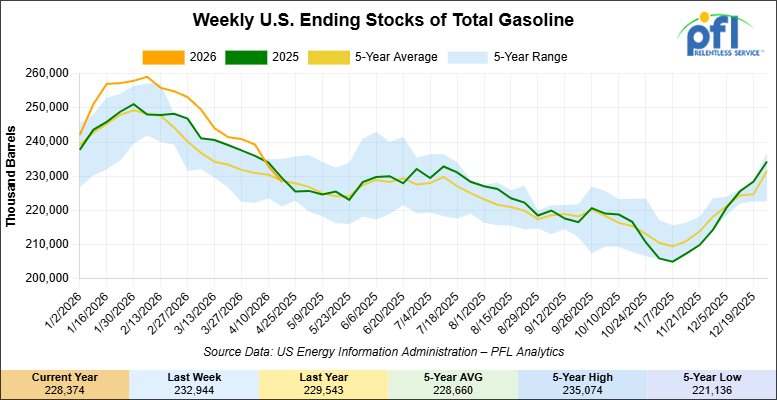 Total motor gasoline inventories decreased by 4.6 million barrels week-over-week and are 0.5 % below the five-year average for this time of year.