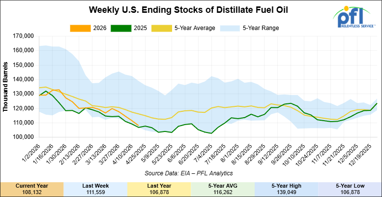 Distillate fuel inventories decreased by 3.4 million barrels week-over-week and are 8% below the five-year average for this time of year.