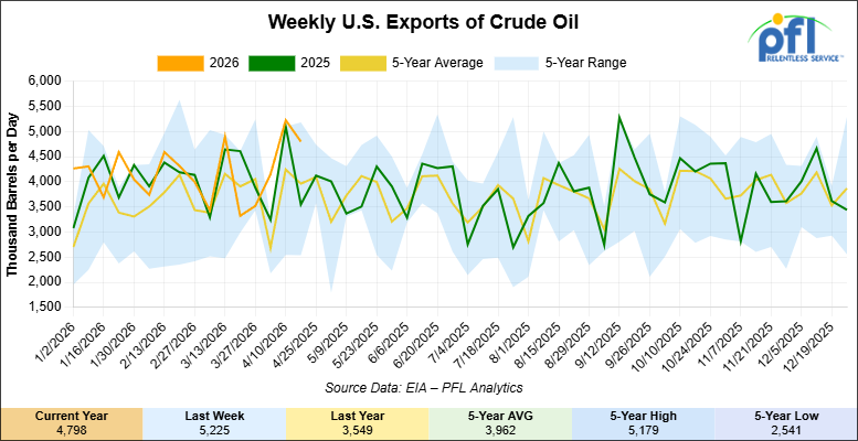 U.S. crude oil exports averaged 4.798 million barrels per day during the week ending April 17, 2026, a decrease of 427,000 barrels per day week-over-week. Over the past four weeks, crude oil exports averaged 4.423 million barrels per day.