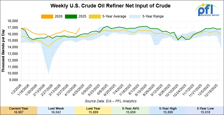 U.S. crude oil refinery inputs averaged 16 million barrels per day during the week ending April 17, 2026, which was 55,000 barrels per day less week-over-week.