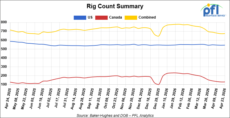 North American rig count was up by +1 rig week-over-week. The US rig count was up by +1 rig week-over-week, but down by -43 rigs year-over-year. The US currently has 544 active rigs. Canada’s rig count was unchanged week-over-week and up by +2 rigs year-over-year. Canada currently has 130 active rigs. Overall, year-over-year we are down by -41 rigs collectively.