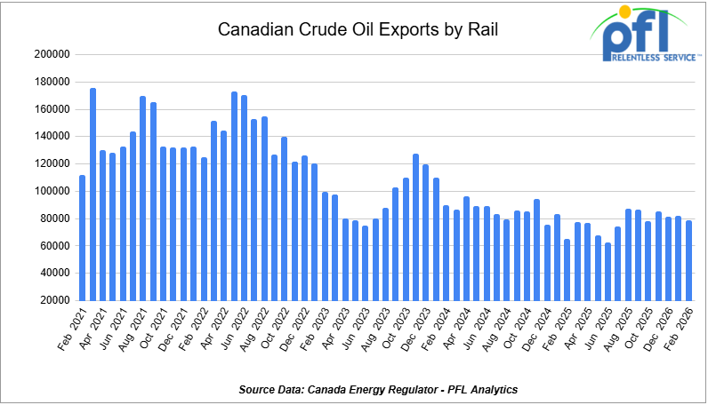The Canadian Energy regulator reported on April 20, 2026, that 79,057 barrels were exported during the month of February 2026, down from 82,183 barrels in January of 2026, a decrease of -3,126  barrels per day month-over-month and its lowest level since October of 2025.