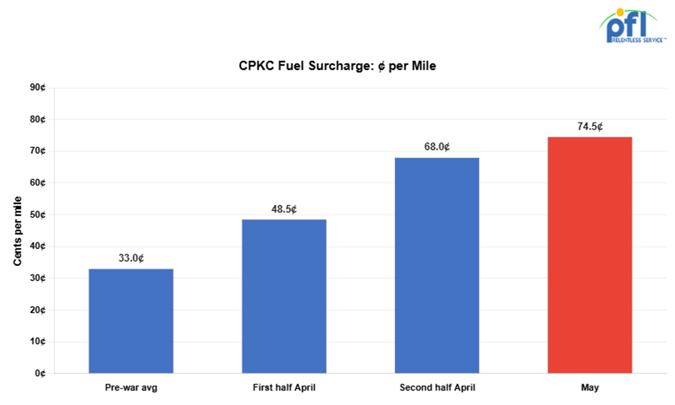 Following up on last week’s coverage of the U.S. Class I surcharge moves, the Canadian carriers are now stepping up similarly. CPKC’s surcharge averaged 33 cents per mile before the Iran war, climbed to 48.5 cents per mile in the first half of April, and 68 cents per mile in the back half. The May surcharge will be 74.5 cents per mile, more than double the pre-war level.