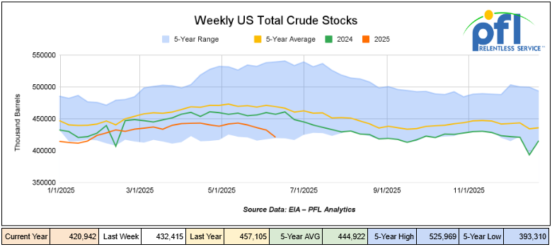 U.S. commercial crude oil inventories (excluding those in the Strategic Petroleum Reserve) a decrease of 11.5 million barrels week-over-week. At 420.9 million barrels, U.S. crude oil inventories are 10% below the five-year average for this time of year.