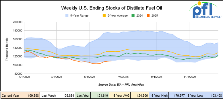 Distillate fuel inventories increased by 500,000 barrels last week and are 17% below the five-year average for this time of year.