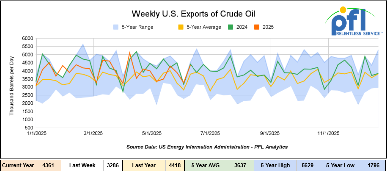 U.S. crude oil exports averaged 4.361 million barrels per day during the week ending June 13, 2025, an increase of 1.075 barrels per day week-over-week. Over the past four weeks, crude oil exports averaged 3.964 million barrels per day.