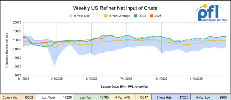 U.S. crude oil refinery inputs averaged 16.9 million barrels per day during the week ending June 13, 2025, which was 365 thousand barrels per day less week-over-week.
