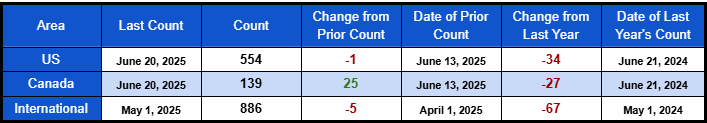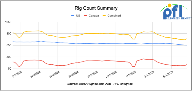 North American rig count was up by 24 rigs week-over-week. U.S. rig count was down -1 rigs week over week and down by -34 rigs year-over-year. The U.S. currently has 555 active rigs. Canada’s rig count was up 25 rigs week-over-week, but down by -27 rigs year-over-year. Canada currently has 139 active rigs. Overall, year-over-year, we are down by -61 rigs collectively.
