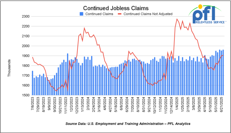 • Continuing jobless claims came in at 1.965 million people, versus the adjusted number of 1.955 million people from the week prior, up 10,000 week-over-week.