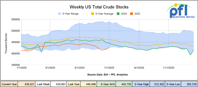 Overall, total commercial petroleum inventories increased by 6.4 million barrels during the week ending July 4, 2025.