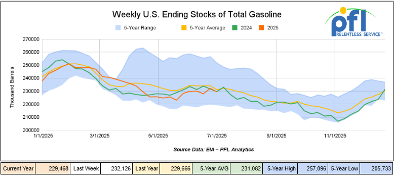 Distillate fuel inventories decreased by 800,000 barrels week-over-week and are 23% below the five-year average for this time of year.