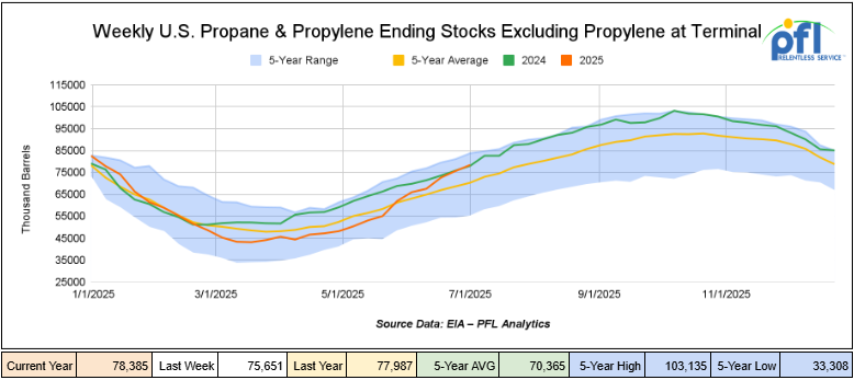 Propane/propylene inventories increased by 2.7 million barrels week-over-week and are 12% above the five-year average for this time of year.