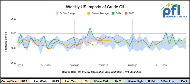 U.S. crude oil imports averaged 6 million barrels per day during the week ending July 4, 2025, a decrease of 906,000 barrels per day week-over-week. Over the past four weeks, crude oil imports averaged 6.1 million barrels per day, 9.6% less than the same four-week period last year. Total motor gasoline imports (including both finished gasoline and gasoline blending components) averaged 832,000 barrels per day, and distillate fuel imports averaged 42,000 barrels per day during the week ending June 27, 2025.