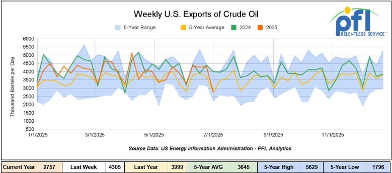 U.S. crude oil exports averaged 2.757 million barrels per day during the week ending July 4, 2025, a decrease of 1.548 million barrels per day week-over-week. Over the past four weeks, crude oil exports averaged 3.923 million barrels per day.