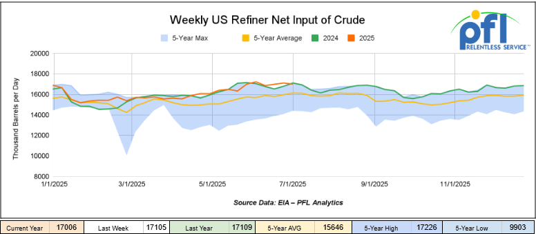 U.S. crude oil refinery inputs averaged 17 million barrels per day during the week ending July 4, 2025, which was 98,000 barrels per day less week-over-week.