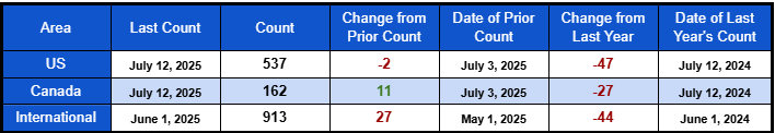 North American rig count was up by 9 rigs week-over-week. U.S. rig count was down -2 rigs week over week and down by -47 rigs year-over-year. The U.S. currently has 537 active rigs. Canada’s rig count was up 11 rigs week-over-week, but down by -27 rigs year-over-year. Canada currently has 162 active rigs. Overall, year-over-year, we are down by -74 rigs collectively.