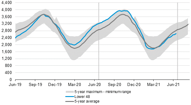 Propane/propylene inventories increased by 1.6 million barrels week over week and are still 18% below the five-year average for this time of year. Propane inventories are concerning and so are natural gas inventories for that matter – we could be subject to price spikes this winter for natural gas and NGL’s as the industry is struggling filling needed storage. Working nat-gas in storage was 2,629 Bcf as of Friday, July 9, 2021, according to EIA estimates. This represents a net increase of 55 Bcf week over week. Stocks are 543 Bcf less than last year at this time and 189 Bcf below the five-year average of 2,818 Bcf. (See Chart)