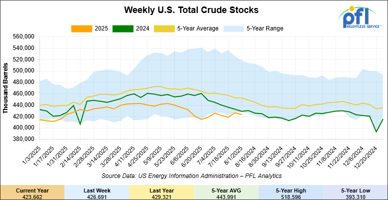 Overall, total commercial petroleum inventories increased by 2.1 million barrels during the week ending August 1, 2025.