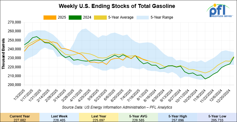 Total motor gasoline inventories decreased by 1.3 million barrels week-over-week and are 1% below the five-year average for this time of year.
