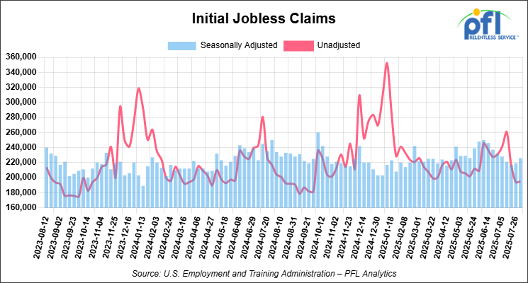 • Initial jobless claims seasonally adjusted for the week ending August 2, 2025, came in at 226,000, up 7,000 people week over week.