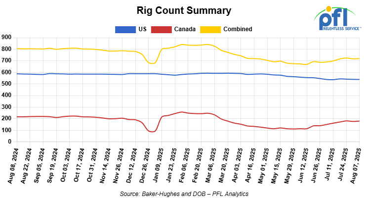 North American rig count was up by 2 rigs week-over-week. The US rig count was down by -1 rigs week-over-week, and down by -49 rigs year-over-year. The US currently has 539 active rigs. Canada’s rig count was up 3 rigs week-over-week, and down by -37 rigs year-over-year. Canada currently has 180 active rigs. Overall, year-over-year we are down by -86 rigs collectively.