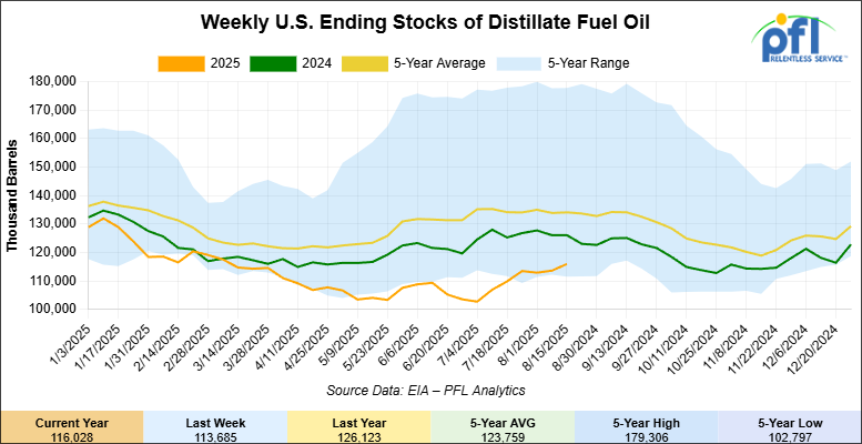Distillate fuel inventories increased by 2.3 million barrels week-over-week and are 13% below the five-year average for this time of year.