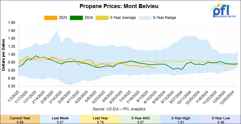 Propane prices closed at 66 cents per gallon on Friday of last week, down 1 cent per gallon week-over-week and down 10 cents year-over-year.