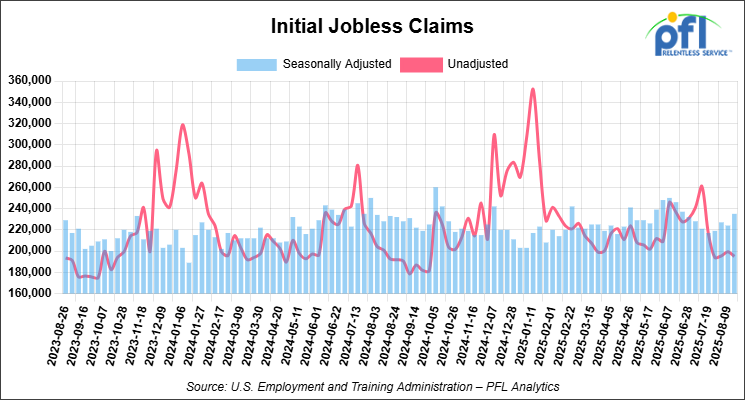 Initial jobless claims seasonally adjusted for the week ending August 23, 2025 came in at 235,000, versus the adjusted number of 224,000 people from the week prior, up 11,000 people week over week.