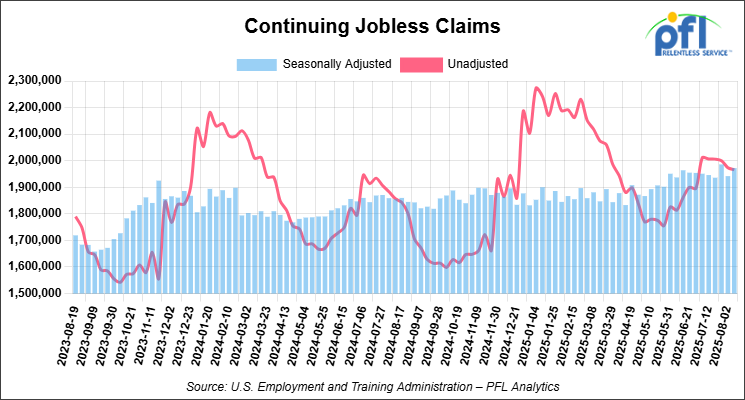 Continuing jobless claims came in at 1,972,000, versus the adjusted number of 1,942,000 people from the week prior, up 30,000 week-over-week.