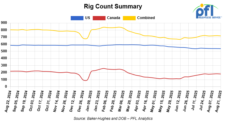 North American rig count was down by 4 rigs week-over-week. The US rig count was down by -1 rig week-over-week, and down by -47 rigs year-over-year. The US currently has 538 active rigs. Canada’s rig count was down by -3 rigs week-over-week and down by -39 rigs year-over-year. Canada currently has 180 active rigs. Overall, year-over-year we are down by -86 rigs collectively.