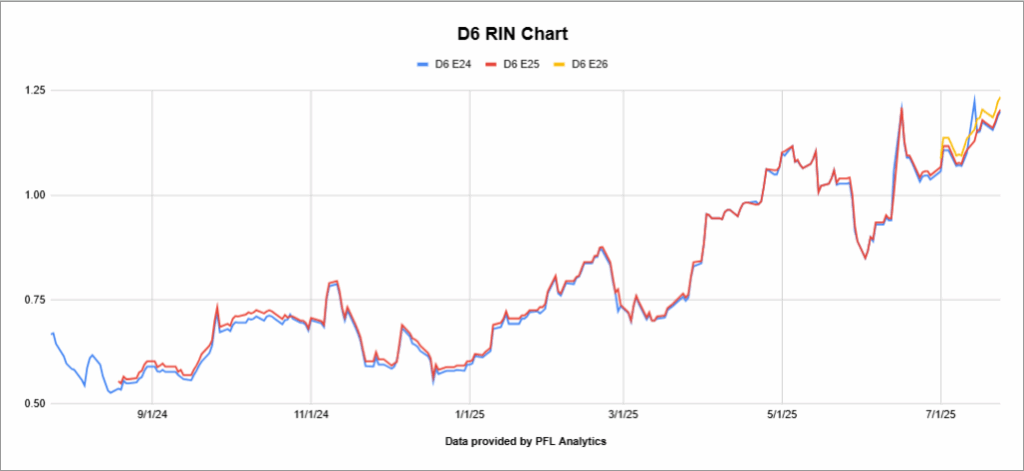 D6 RINS have been on a tear in 2025, and liquidity has increased substantially since the beginning of the year.  On January 3, 2025,  2025 D6 RINS closed at 62 cents per RIN that is up 46 and ½ cents per RIN since the beginning of the year. See Chart below: