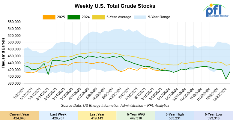 U.S. commercial crude oil inventories (excluding those in the Strategic Petroleum Reserve) increased by 3.9 million barrels week-over-week. At 424.6 million barrels, U.S. crude oil inventories are 3% below the five-year average for this time of year