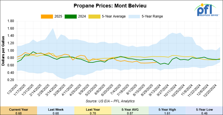 Propane prices closed at 68 cents per gallon on Friday of last week, up 1 cent per gallon week-over-week, and down 8 cents per gallon year-over-year.