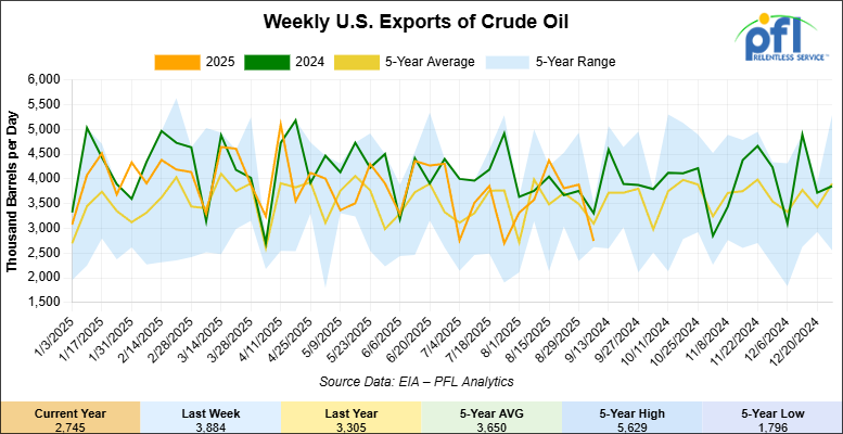 U.S. crude oil exports averaged 2.745 million barrels per day during the week ending September 5, 2025, a decrease of 1.139 million barrels per day week-over-week. Over the past four weeks, crude oil exports averaged 3.703 million barrels per day.