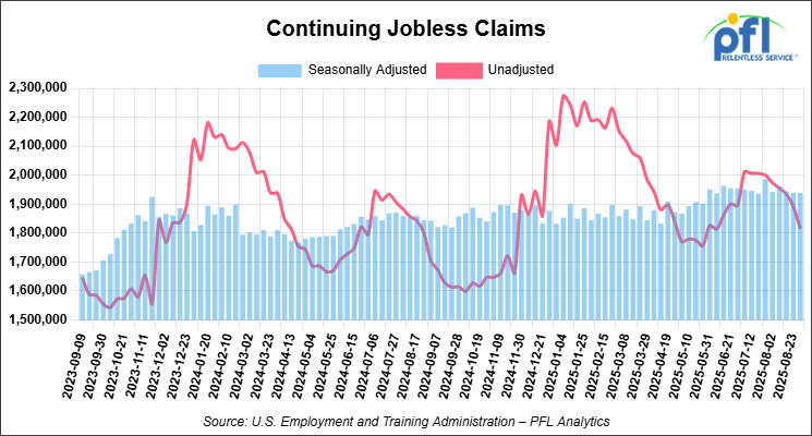 • Continuing jobless claims came in at 1,939,000, versus the adjusted number of 1,939,000 people from the week prior, flat week over week.