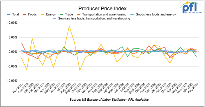 In August, the PPI for final demand declined 0.1% m/m after rising 0.7% in July, and increased 2.2% y/y. Core PPI (final demand less foods, energy, and trade services) rose 0.3% m/m and 2.6% y/y. The monthly decline was driven by services (−0.2%), including a 1.7% drop in trade margins; transportation and warehousing rose 0.9%, and services excluding trade, transportation, and warehousing were up 0.3%. Goods prices edged up 0.1%, including +0.1% for foods, −0.4% for energy, and +0.3% for goods excluding food and energy.