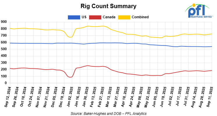 North American rig count was up by +7 rigs week-over-week. US rig count was up by +2 rigs week-over-week, but down by -51 rigs year-over-year. The US currently has 539 active rigs. Canada’s rig count was up by +5 rigs week-over-week, but down by -32 rigs year-over-year. Canada currently has 186 active rigs. Overall, year-over-year we are down by -83 rigs collectively.