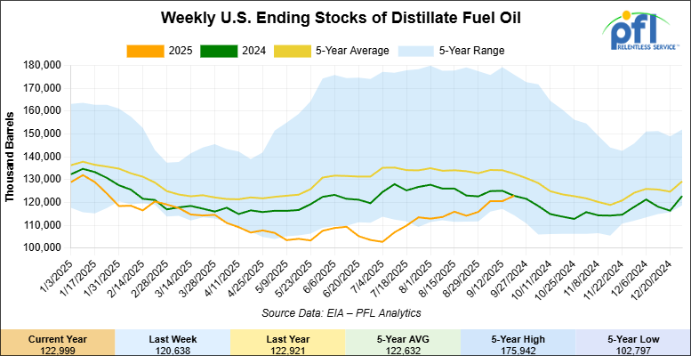 Distillate fuel inventories decreased by 1.7 million barrels week-over-week and are 8% below the five-year average for this time of year.