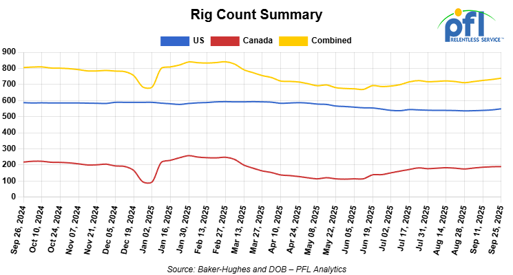 North American rig count was up by +8 rigs week-over-week. The US rig count was up by +7 rigs week-over-week, but down by -38 rigs year-over-year. The US currently has 549 active rigs. Canada’s rig count was up by +1 rig week-over-week, but down by -28 rigs year-over-year. Canada currently has 190 active rigs. Overall, year-over-year we are down by -66 rigs collectively.