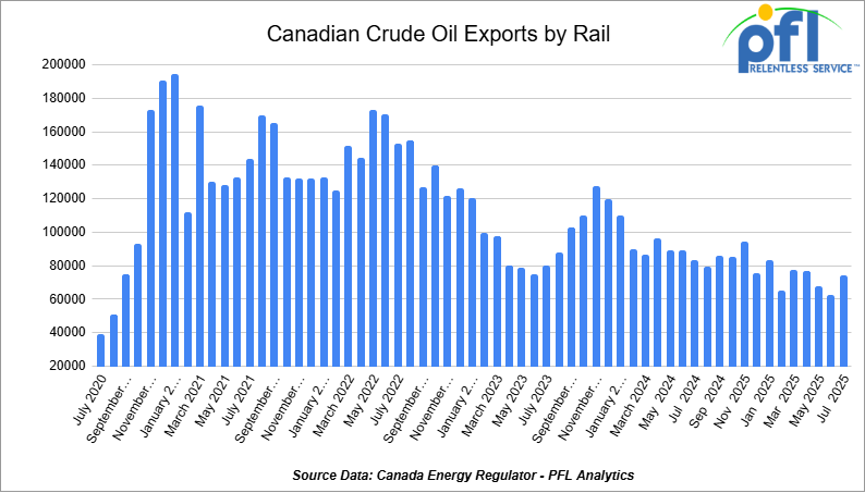 Crude by rail out of Canada increased month over month. The Canadian Energy regulator reported on September 25, that 74,031 barrels were exported per day during the month of July 2025, up from 62,847 barrels in June of 2025, an increase of 11,184 barrels per day, month over month after two consecutive month-over-month declines.